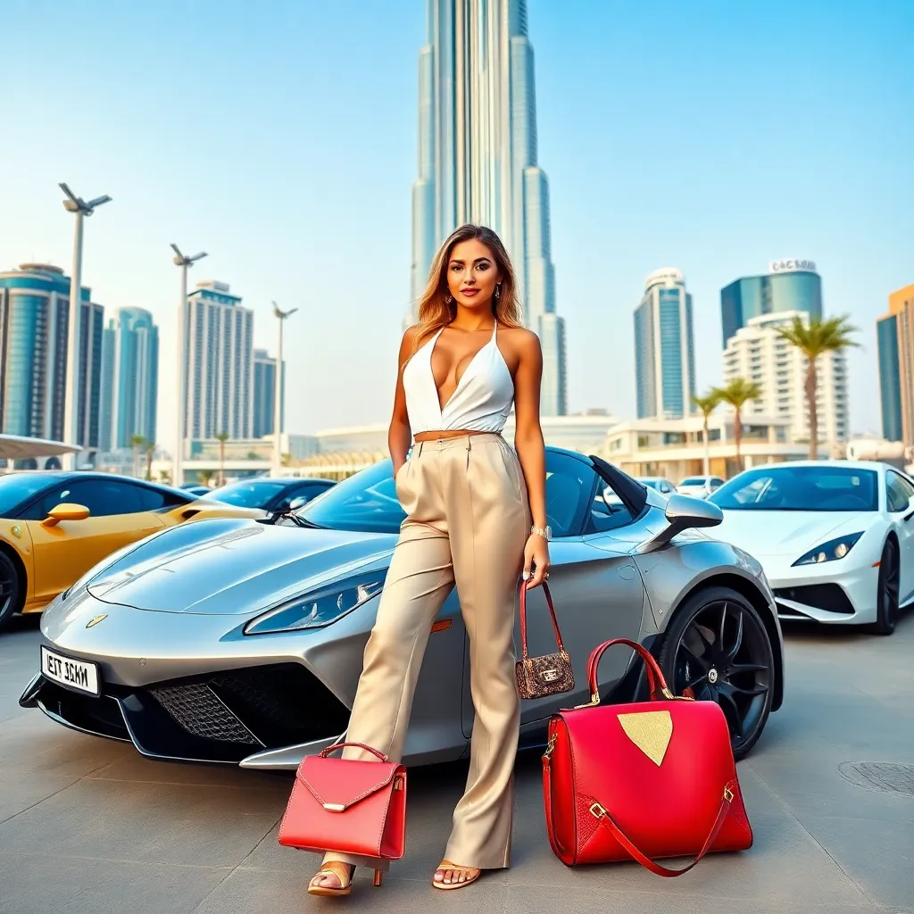 Capture the essence of Dubai's luxurious lifestyle! Imagine a stunning influencer posing in front of the iconic Burj Khalifa, surrounded by sleek sports cars and designer handbags. The city's vibrant colors and futuristic architecture blend with the influencer's glamorous outfit, exuding sophistication and opulence. What's the influencer's style?