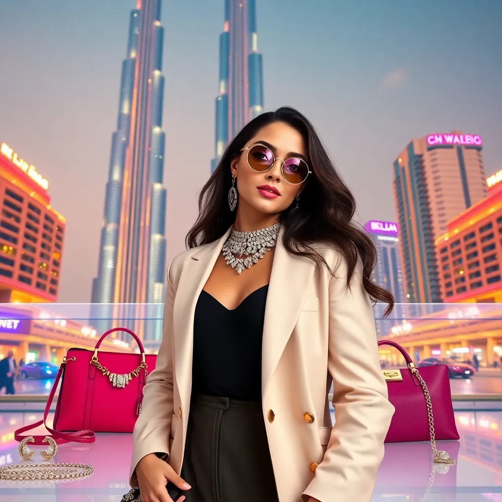 Capture the essence of Dubai's opulence! Create an AI image of a stylish influencer posing in front of the iconic Burj Khalifa, surrounded by luxurious jewelry and designer handbags. Incorporate vibrant colors and dramatic lighting to convey the glamour and extravagance of this Middle Eastern metropolis.