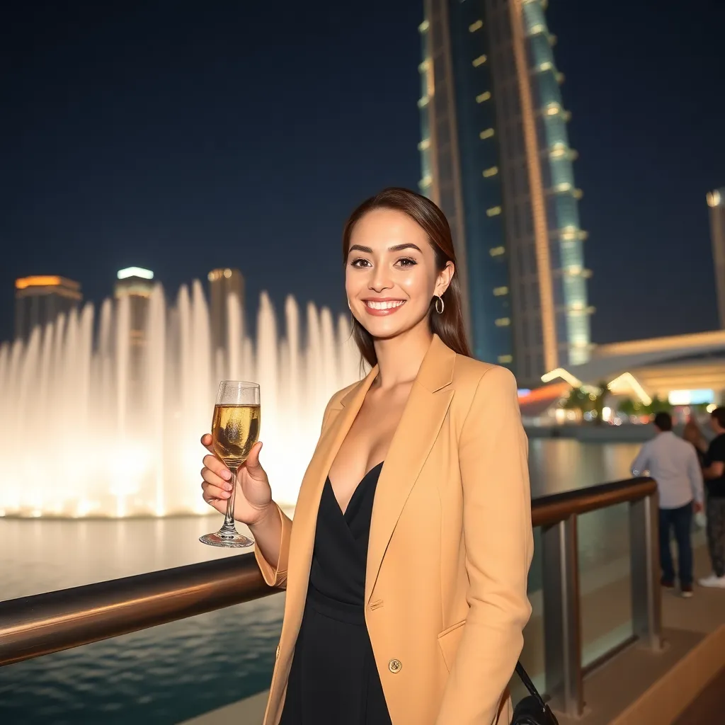 Capture the essence of Dubai's luxurious lifestyle as a social media influencer! Imagine yourself standing in front of the iconic Burj Khalifa, with the Dubai Fountain show in the background. You're dressed in the latest designer wear, holding a champagne flute and giving a radiant smile. What's your Instagram caption?