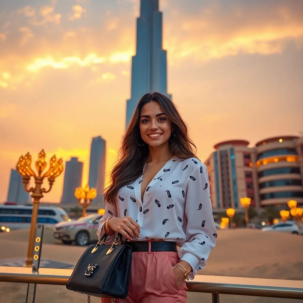 Capture the essence of Dubai's opulence! Create an AI-generated image of a stylish influencer standing in front of the iconic Burj Khalifa, surrounded by a stunning cityscape at sunset. The influencer should be dressed in a glamorous outfit, with a luxurious handbag and sunglasses, exuding confidence and sophistication.