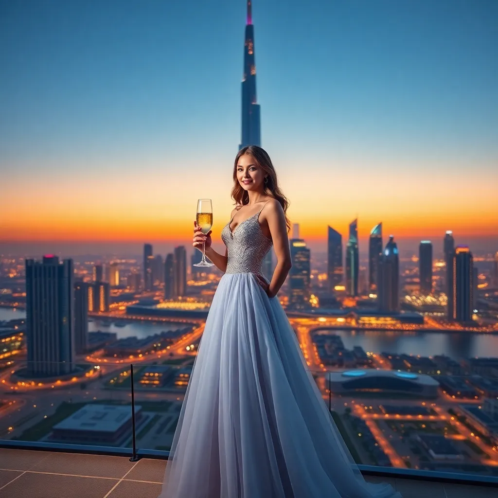 Create a stunning AI-generated image of a Dubai influencer posing in front of the iconic Burj Khalifa at sunset, wearing a glamorous evening gown and holding a champagne flute, with the city's vibrant skyline and twinkling lights in the background, capturing the essence of luxury and opulence in Dubai.