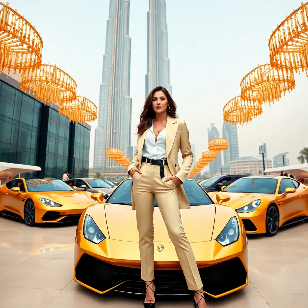 Capture the essence of Dubai's opulence! Create an AI-generated image of a stunning influencer posing against the iconic Burj Khalifa, surrounded by lavish gold and diamonds, with a sleek sports car and a futuristic cityscape in the background. Think glamour, luxury, and the ultimate Dubai experience.