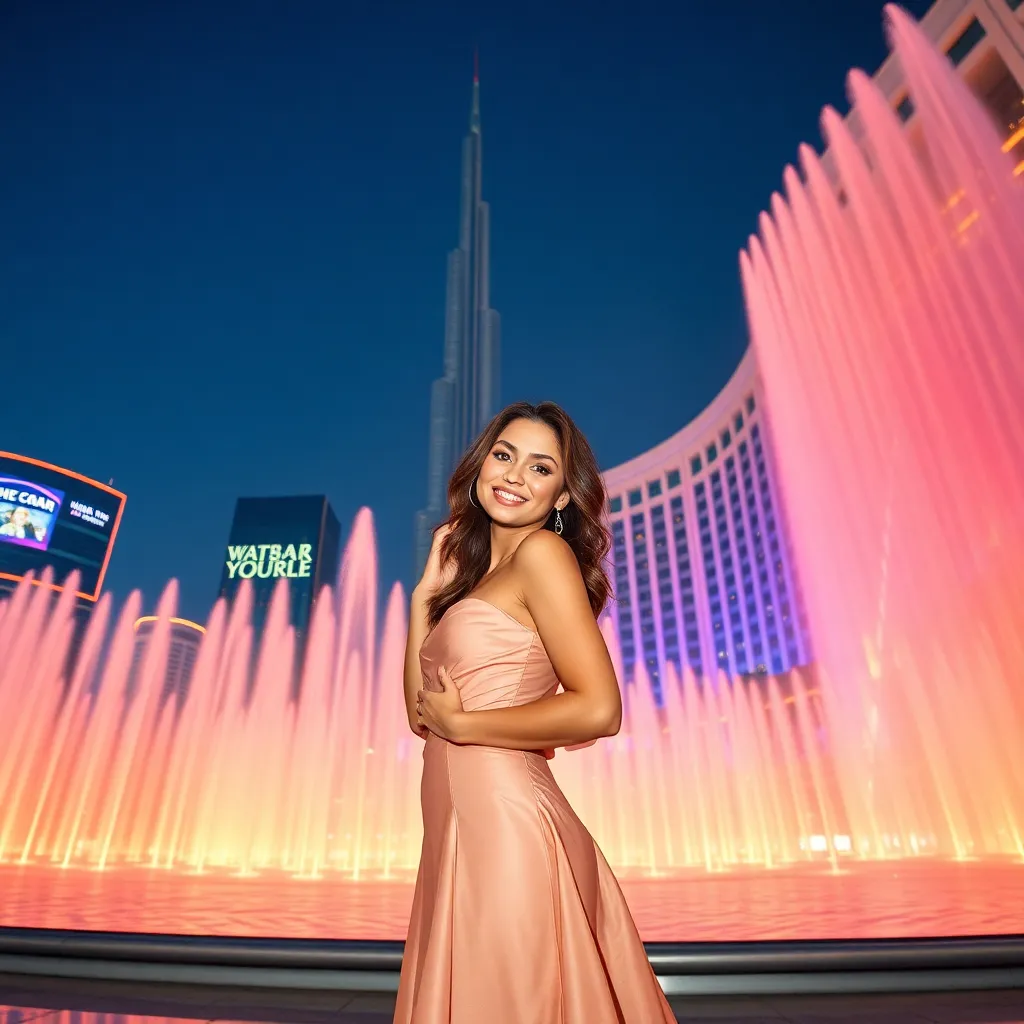 Create a stunning AI image of a Dubai influencer posing in front of the iconic Burj Khalifa, surrounded by the vibrant colors of the Dubai Mall fountain show. The influencer should be dressed in a glamorous evening gown, with a confident smile and a hint of glamour, capturing the essence of luxury and style in the city of gold.