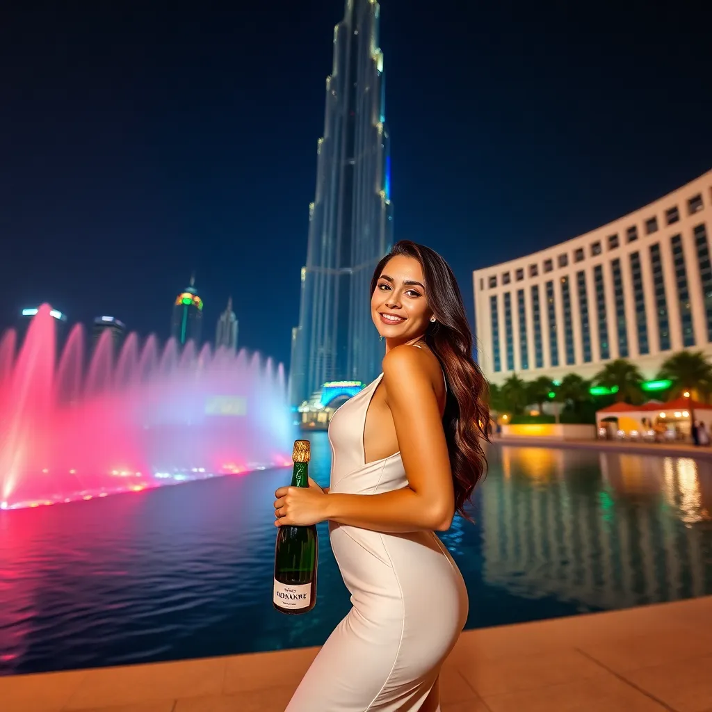 Capture the essence of Dubai's vibrant nightlife! Imagine a stunning influencer posing in front of the iconic Burj Khalifa, surrounded by a kaleidoscope of colors and lights from the Dubai Fountain Show. The influencer is dressed in a glamorous outfit, with a confident smile and a champagne bottle in hand.