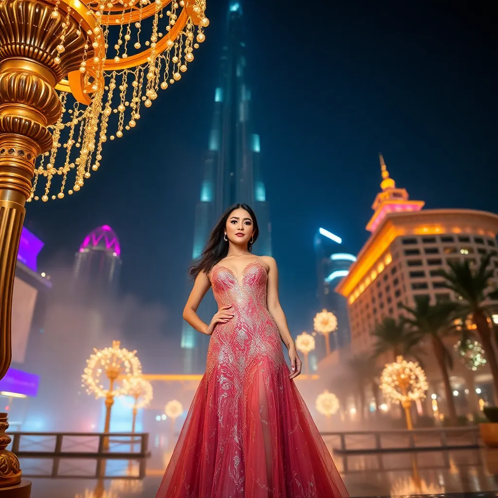 Capture the opulence of Dubai! Imagine a stunning influencer posing in front of the iconic Burj Khalifa, surrounded by luxurious gold accents and vibrant city lights. Wearing a glamorous evening gown, she's surrounded by a haze of mist and twinkling lights, exuding elegance and sophistication. Create an unforgettable AI image!