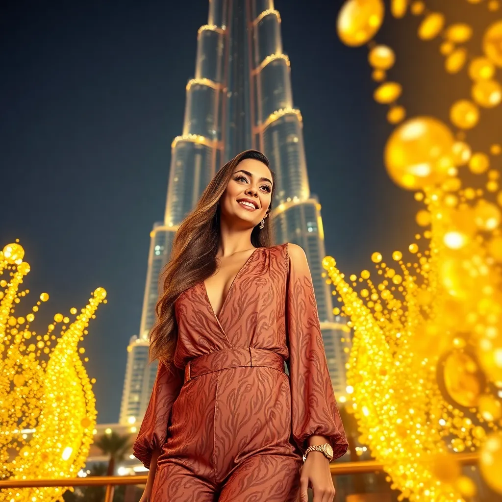 Capture the essence of Dubai's opulence! Imagine a stunning influencer posing in front of the iconic Burj Khalifa, surrounded by a luxurious backdrop of gold and diamonds. The influencer is dressed in a glamorous outfit, with a subtle desert-inspired pattern, and a confident smile. The image should exude glamour and sophistication.