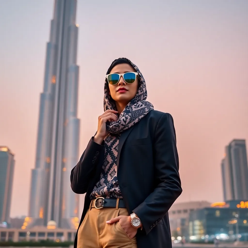 Create a stunning AI-generated image of a Dubai influencer posing in front of the iconic Burj Khalifa, dressed in the latest Arabic-inspired fashion, with a subtle desert sunset glow and a pair of luxurious sunglasses, conveying confidence and style. The image should exude a sense of luxury and sophistication.