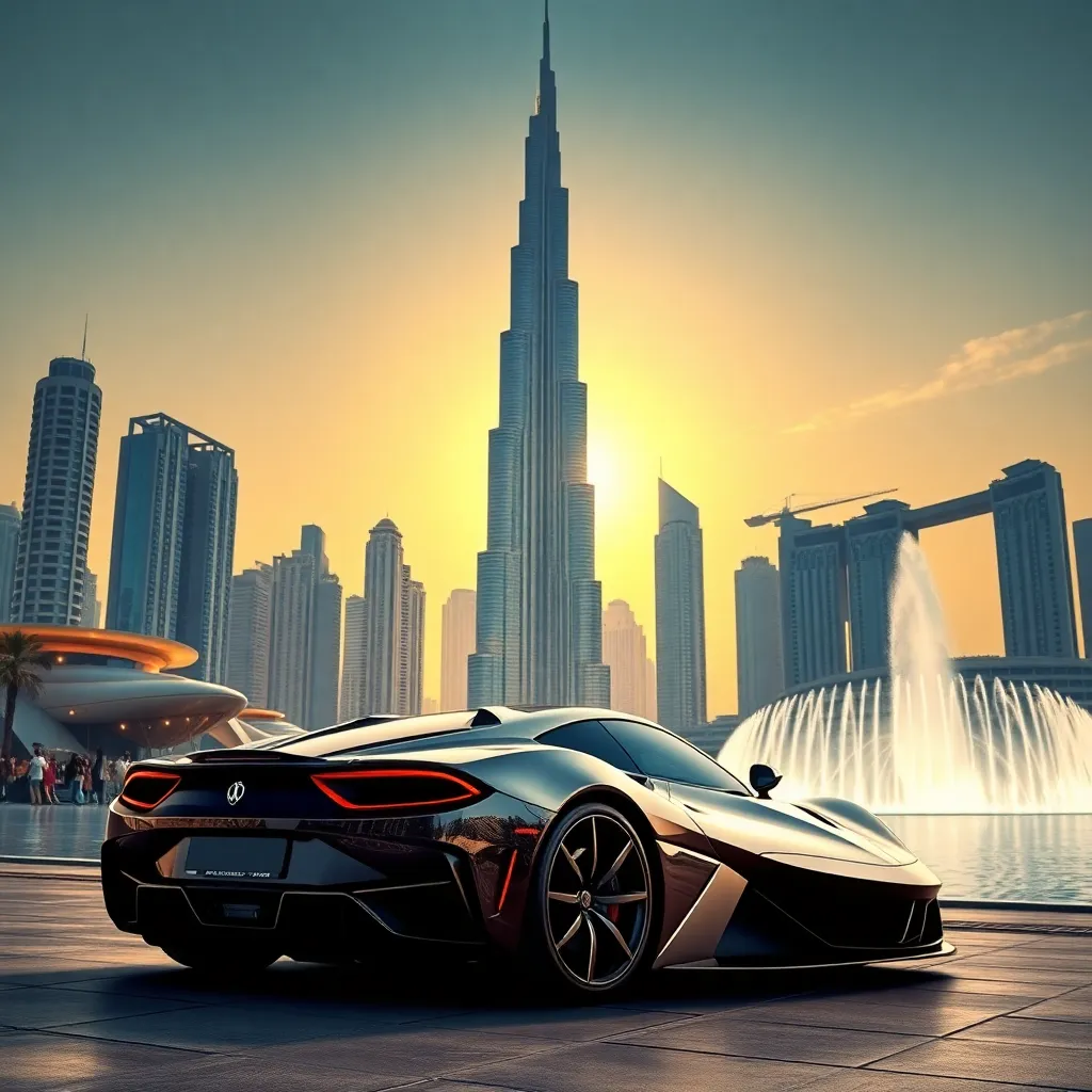 Capture the essence of Dubai's vibrant nightlife in a stunning AI-generated image. Imagine a futuristic skyscraper, like the Burj Khalifa, illuminated at dusk with a cityscape of sleek skyscrapers, bustling streets, and iconic landmarks like the Dubai Mall and Palm Jumeirah. Add a touch of glamour with a supercar and a glamorous couple.