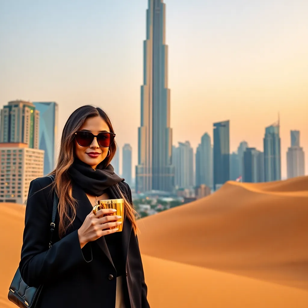 Imagine yourself standing in front of the iconic Burj Khalifa, the world's tallest building, in Dubai. You're dressed in the latest fashion trends and holding a luxurious gold-plated coffee cup. The city's vibrant skyline and golden desert sand dunes serve as a stunning backdrop. Capture your glamorous moment!