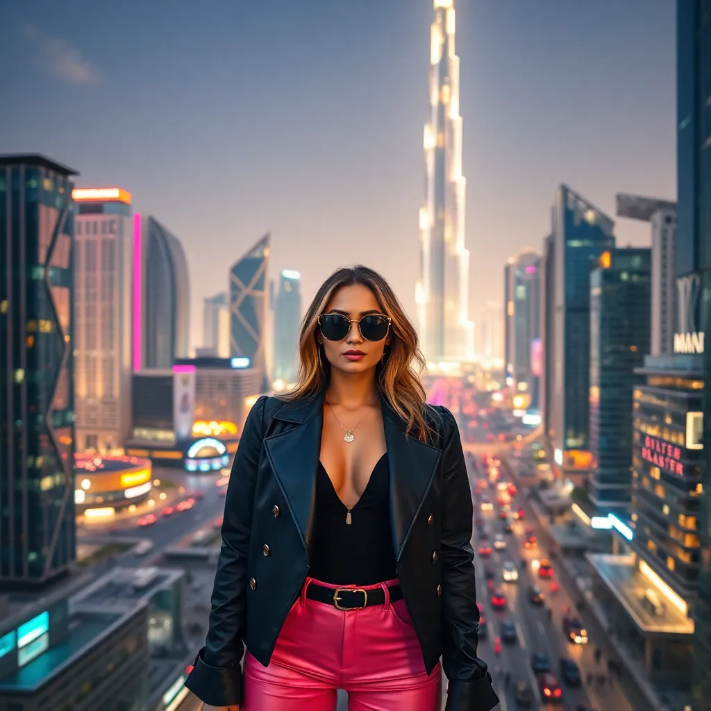 Capture the essence of Dubai's vibrant nightlife in a stunning AI-generated image. Imagine a futuristic cityscape with the iconic Burj Khalifa lit up in neon lights, surrounded by sleek skyscrapers and bustling streets. Incorporate a glamorous influencer in the foreground, dressed in the latest fashion trends, with a city view in the background.