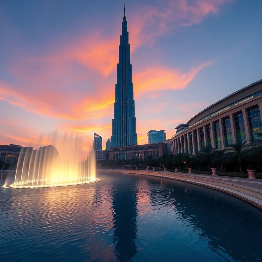 Capture the essence of Dubai's opulence in an AI-generated image. Imagine a stunning sunset over the Burj Khalifa, with the world's tallest building's reflection gleaming on the serene waters of the Dubai Fountain. Incorporate vibrant colors and a sense of luxury, as if the city's extravagance has come to life.