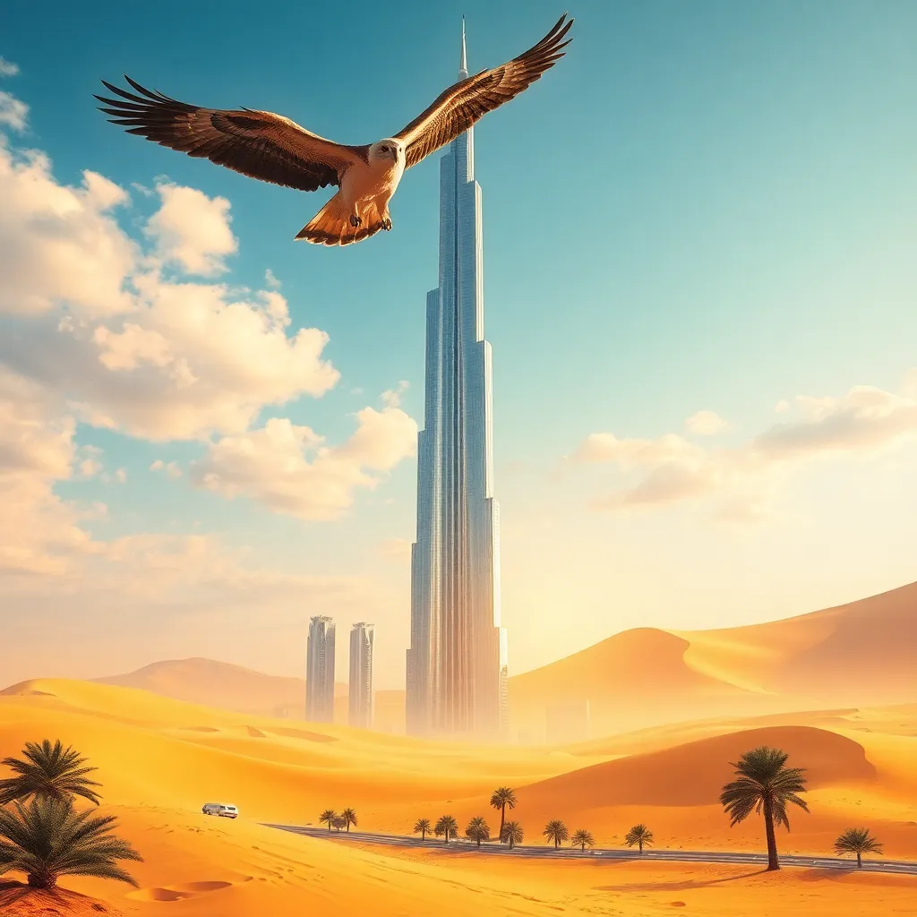 Capture the essence of Dubai's opulence in a stunning AI-generated image. Imagine a futuristic skyscraper, the Burj Khalifa, standing tall amidst a vibrant desert landscape with a majestic falcon soaring overhead. Incorporate warm golden hues and a hint of luxury, as if the city's excesses are on full display.