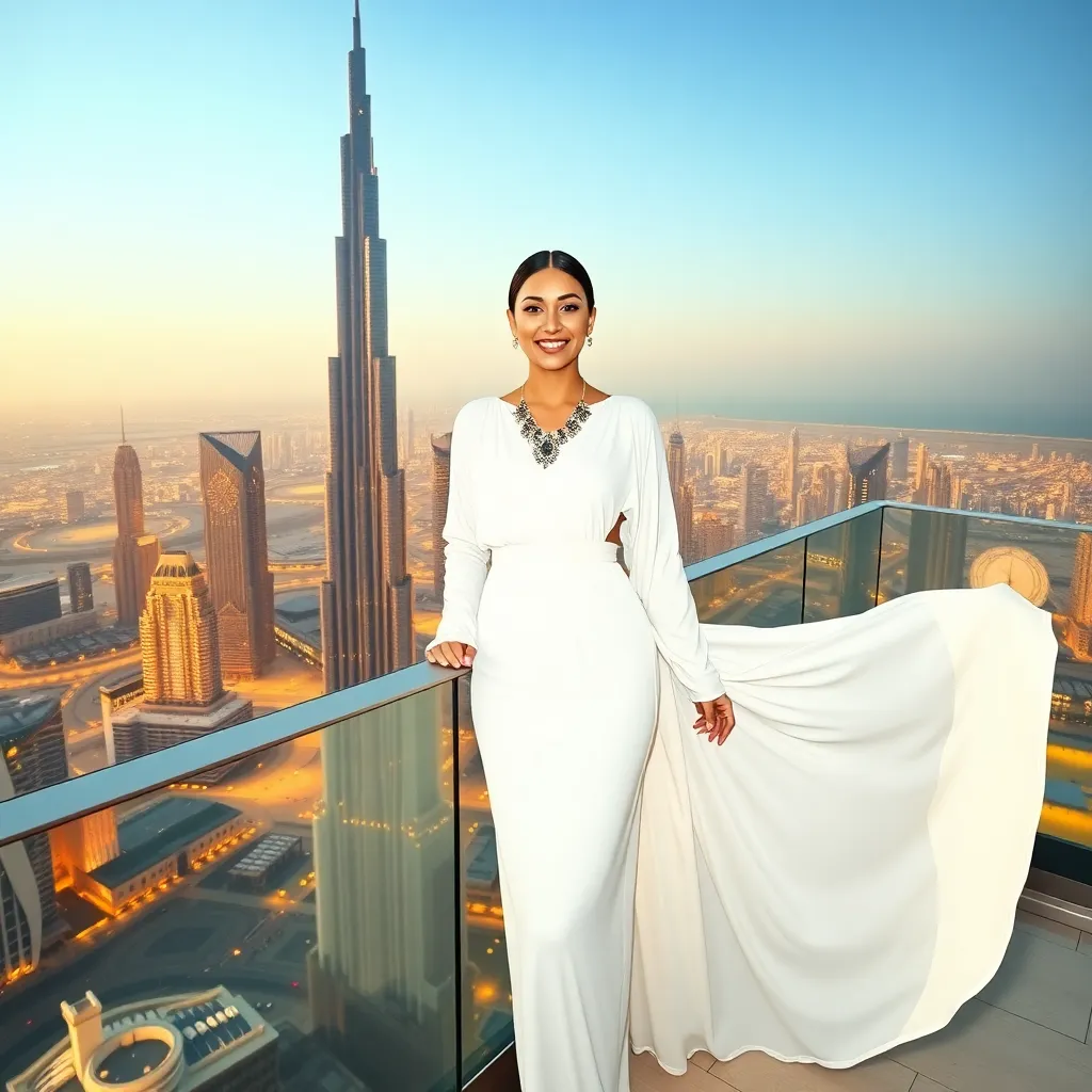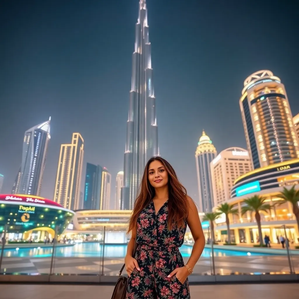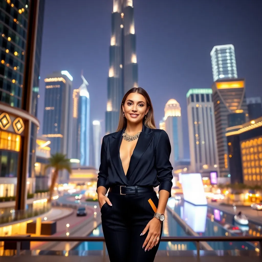 Capture the essence of Dubai's opulence! Create an AI-generated image of a stylish influencer posing in front of the iconic Burj Khalifa, surrounded by gleaming skyscrapers and a vibrant cityscape. Dress the influencer in a stunning outfit, complete with statement jewelry and a confident smile, against a backdrop of twinkling lights and futuristic architecture.