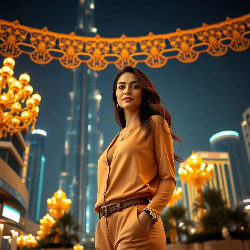 Capture the essence of Dubai's opulence! Imagine a stunning influencer standing in front of the iconic Burj Khalifa, surrounded by lavish gold accents and vibrant city lights. The influencer is dressed in a chic, desert-inspired outfit, with a subtle smile and a hint of glamour. Create a breathtaking AI image that embodies the city's luxurious spirit!