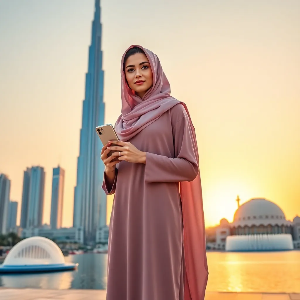 Create a stunning AI-generated image of a Dubai influencer standing in front of the iconic Burj Khalifa, dressed in a stylish abaya and holding a sleek smartphone. The background should be a warm sunset, with the city's futuristic skyline and Dubai Fountain in the distance. Make it Instagram-worthy!