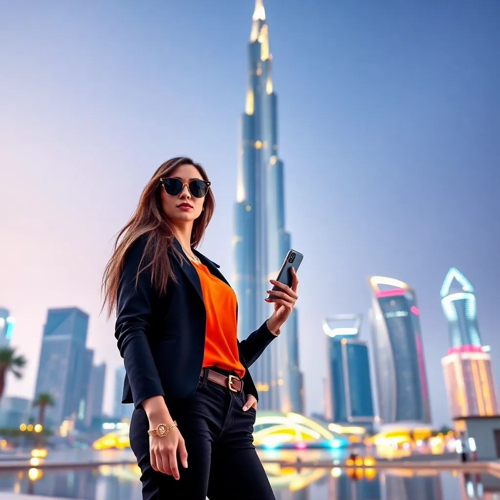 Create a stunning AI-generated image of a Dubai influencer posing in front of the iconic Burj Khalifa, with a luxurious background and a subtle cityscape view. The influencer should be dressed in a trendy outfit, with a confident expression and a smartphone in hand, as if capturing the breathtaking view.