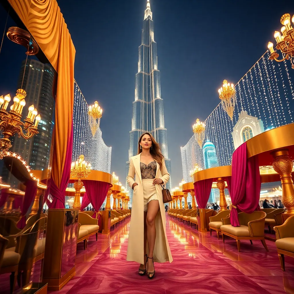 Capture the essence of Dubai's opulence! Create an AI-generated image of a stylish influencer posing in front of the iconic Burj Khalifa, surrounded by a luxurious backdrop of gold accents, lavish fabrics, and sparkling lights. Incorporate the city's vibrant colors and architectural marvels to make the image truly unforgettable.