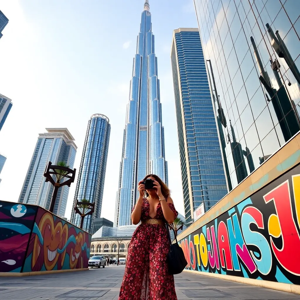 Capture the essence of Dubai's luxurious lifestyle as a social media influencer! Imagine yourself standing in front of the iconic Burj Khalifa, surrounded by sleek skyscrapers and vibrant street art. You're dressed in a stunning outfit, with a camera in hand, ready to snap a breathtaking shot for your followers.