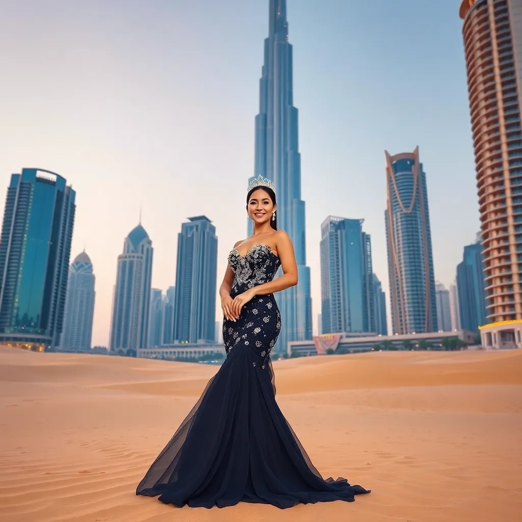 Capture the essence of Dubai's luxury and opulence! Imagine a stunning influencer standing in front of the iconic Burj Khalifa, surrounded by a sea of golden sand and sleek skyscrapers. The influencer is dressed in a glamorous evening gown, with a sparkling tiara and a confident smile. Create a breathtaking AI image that embodies the glamour and sophistication of this Middle Eastern metropolis.