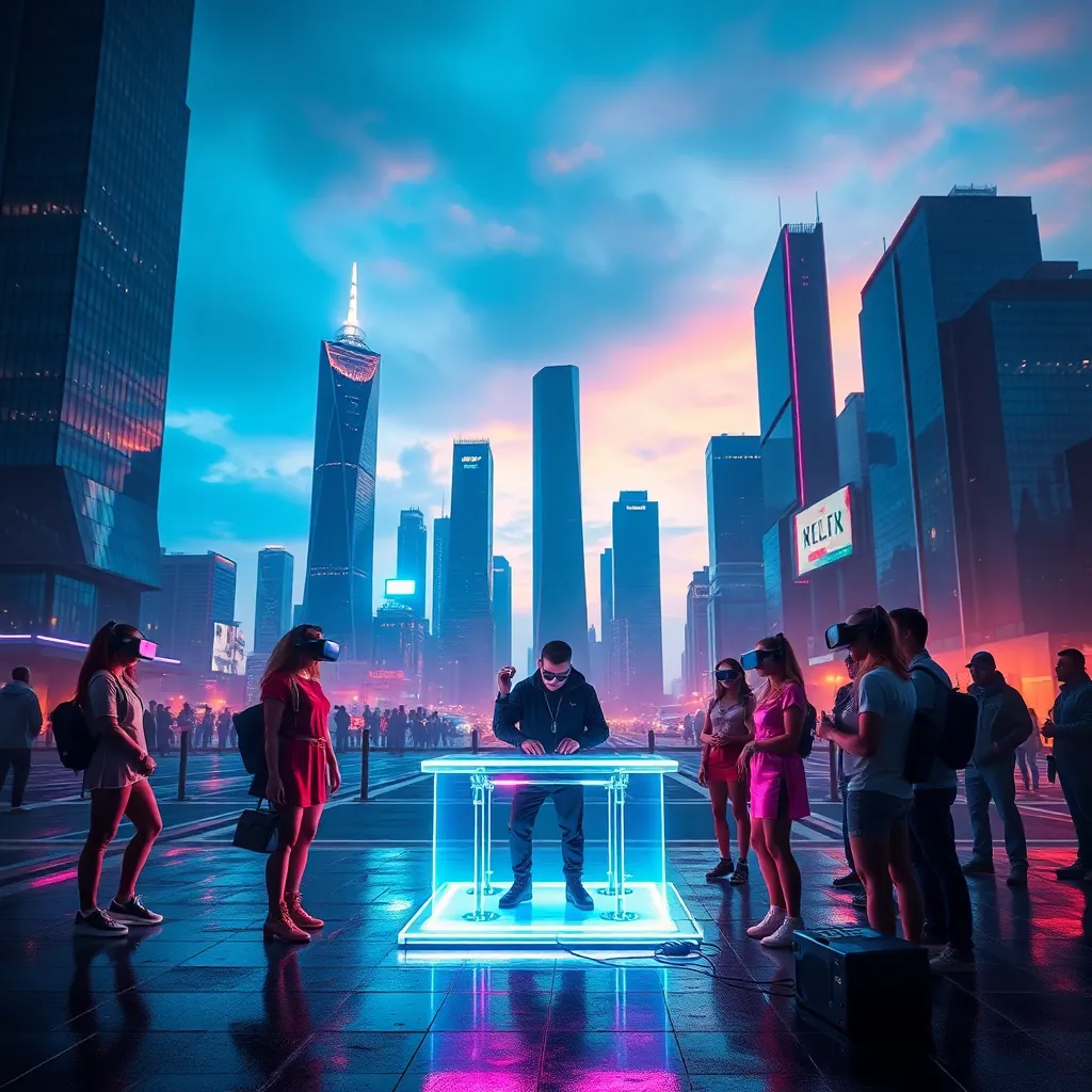 Create a futuristic cityscape at sunset, with sleek skyscrapers and neon lights reflecting off the wet pavement. In the foreground, a group of stylishly dressed individuals, likely e-girls and e-boys, gather around a holographic DJ spinning a sick beat, surrounded by virtual reality headsets and futuristic gadgets.