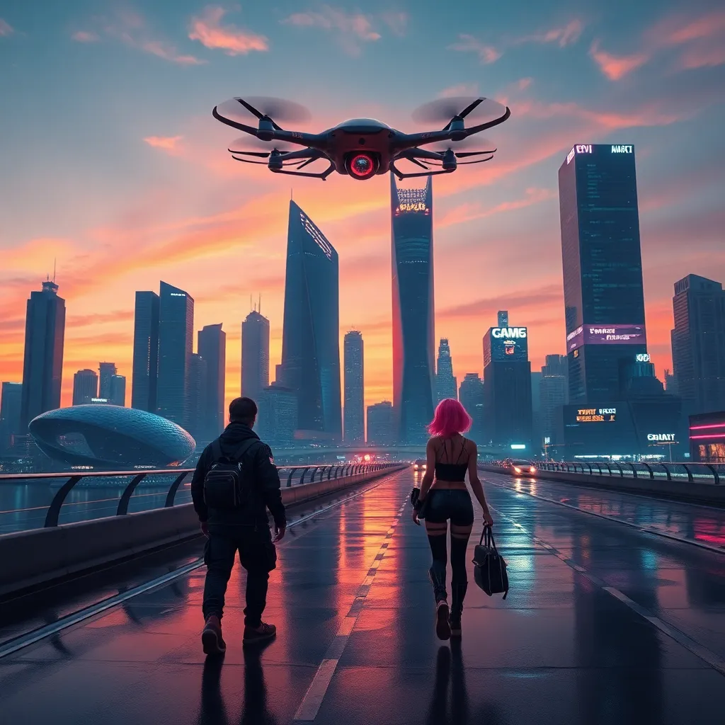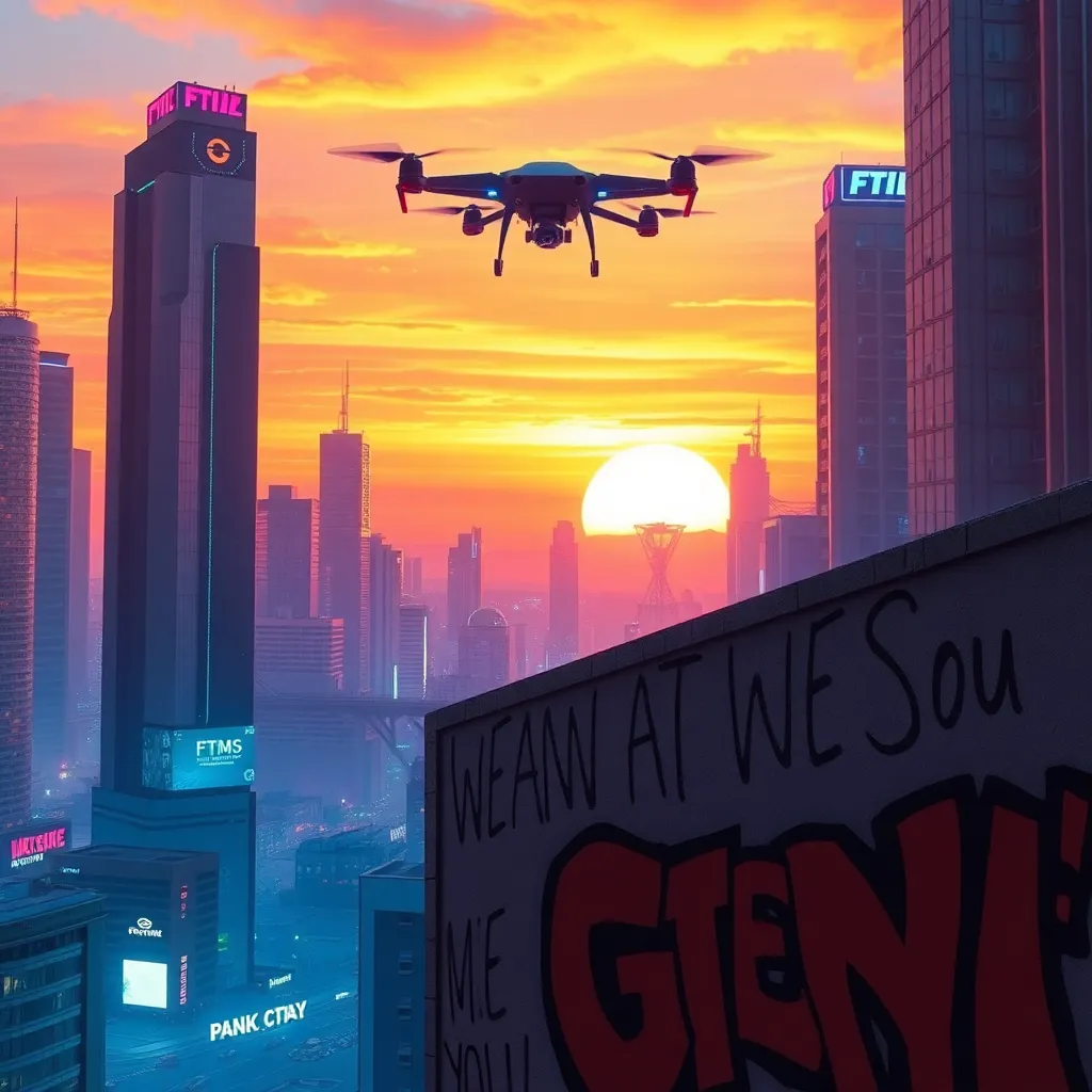 Create a futuristic cityscape at sunset with sleek skyscrapers, neon lights, and a hovering drone in the sky. Incorporate a bold, graffiti-covered wall with a mysterious message. Use vibrant colors and blend realistic textures with futuristic elements. The atmosphere should be both dystopian and mesmerizing.