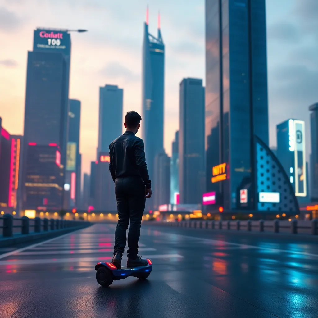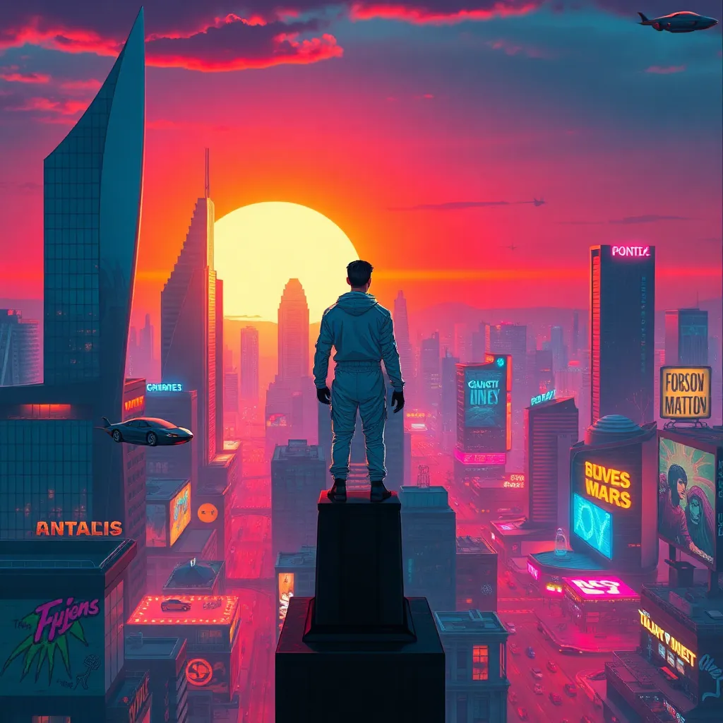Create a futuristic, neon-lit cityscape at sunset. Incorporate sleek skyscrapers, hovering cars, and a vibrant street art scene. A lone figure, dressed in a futuristic jumpsuit, stands atop a skyscraper, gazing out at the city with a hint of nostalgia and longing. Incorporate bold colors and dynamic lighting.