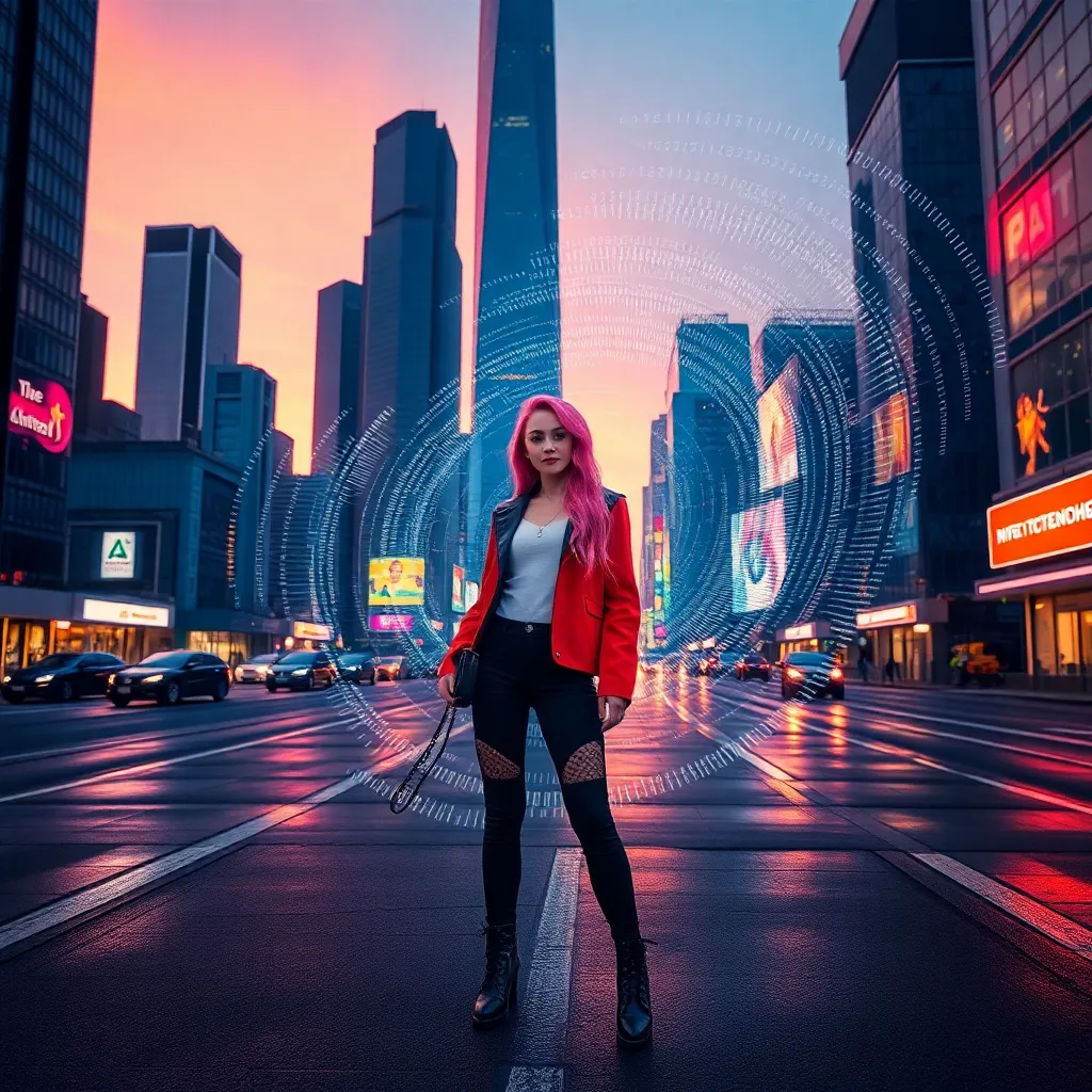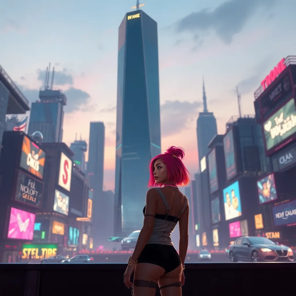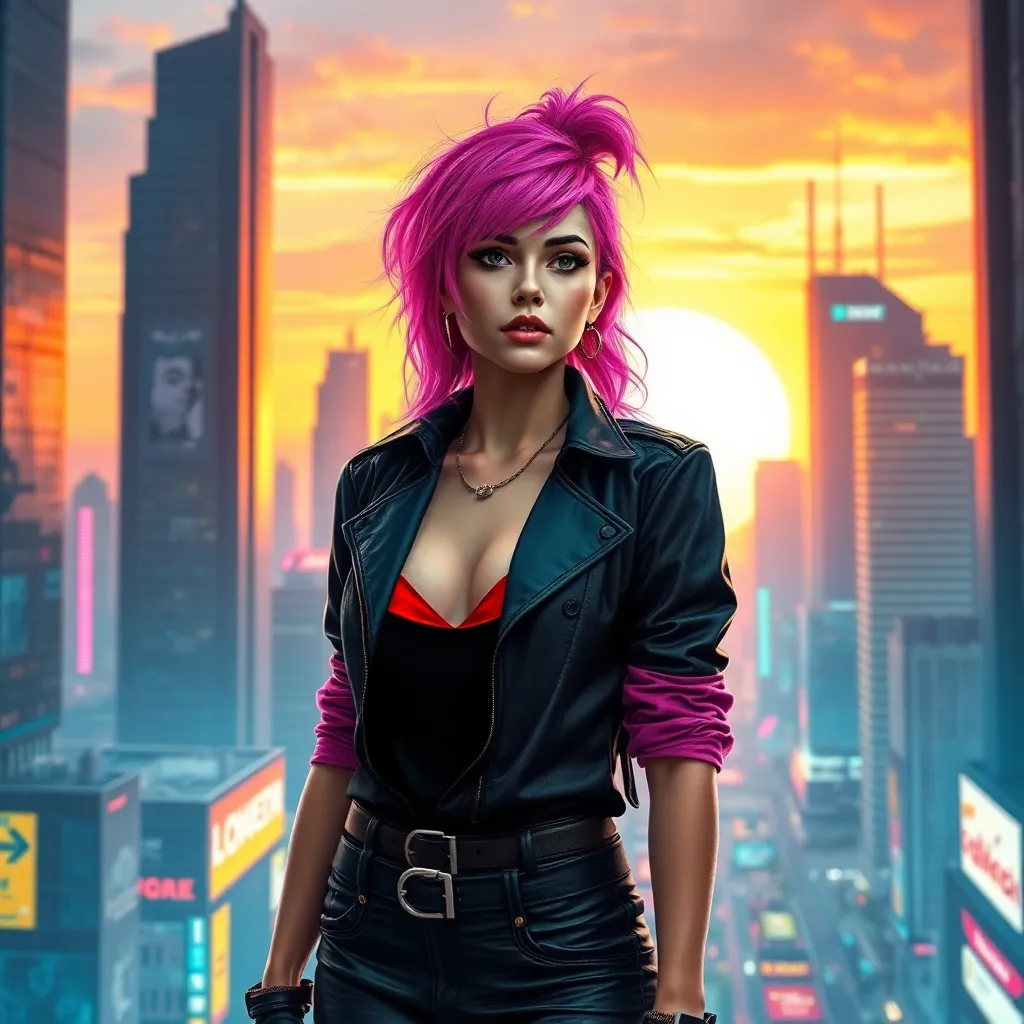Create a futuristic, neon-lit cityscape at sunset, with towering skyscrapers and holographic advertisements. In the foreground, a young woman with vibrant pink hair and a bold, cyberpunk-inspired outfit stands confidently, gazing out at the city with a mix of determination and rebelliousness in her expression.