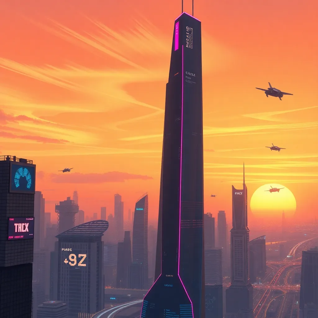 Create a futuristic cityscape at sunset, with a sleek, neon-lit skyscraper in the center. The building's exterior is a mesmerizing blend of curves and angles, with holographic advertisements and fiber-optic cables snaking around its facade. The surrounding city is bustling with flying cars and levitating pedestrians.