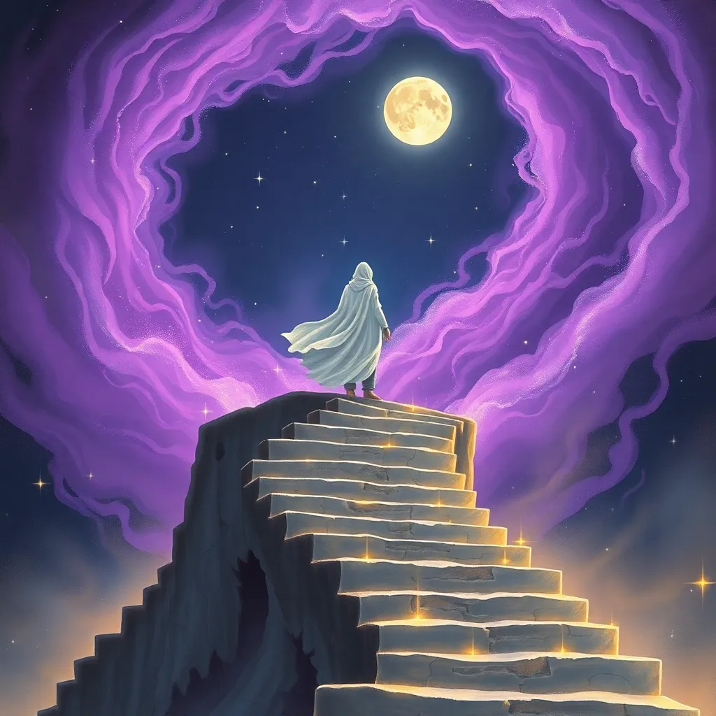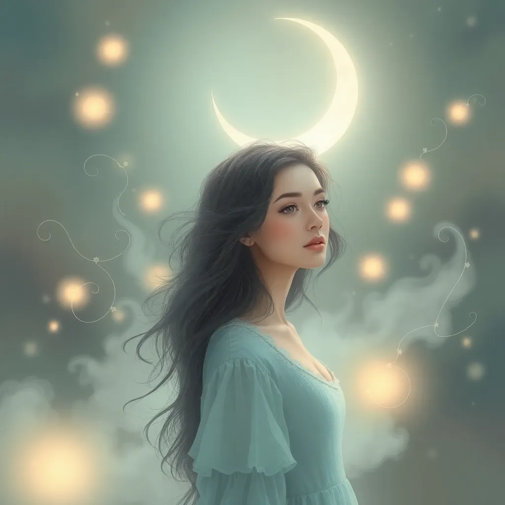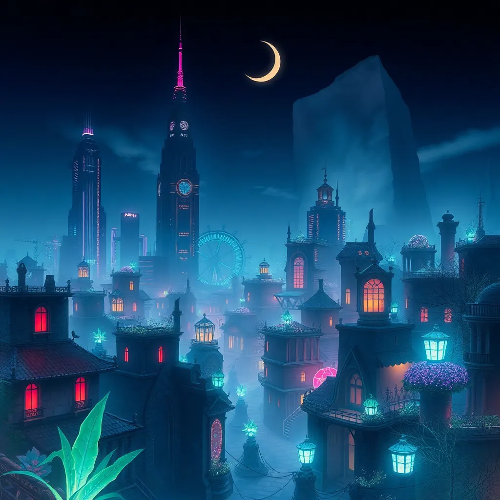 Create an ethereal, futuristic cityscape at dusk. Incorporate glowing neon skyscrapers, wispy clouds, and a crescent moon. A lone figure, dressed in a flowing, iridescent jumpsuit, stands atop a towering building, gazing out at the city. The atmosphere should be dreamy, with a hint of magic and wonder.