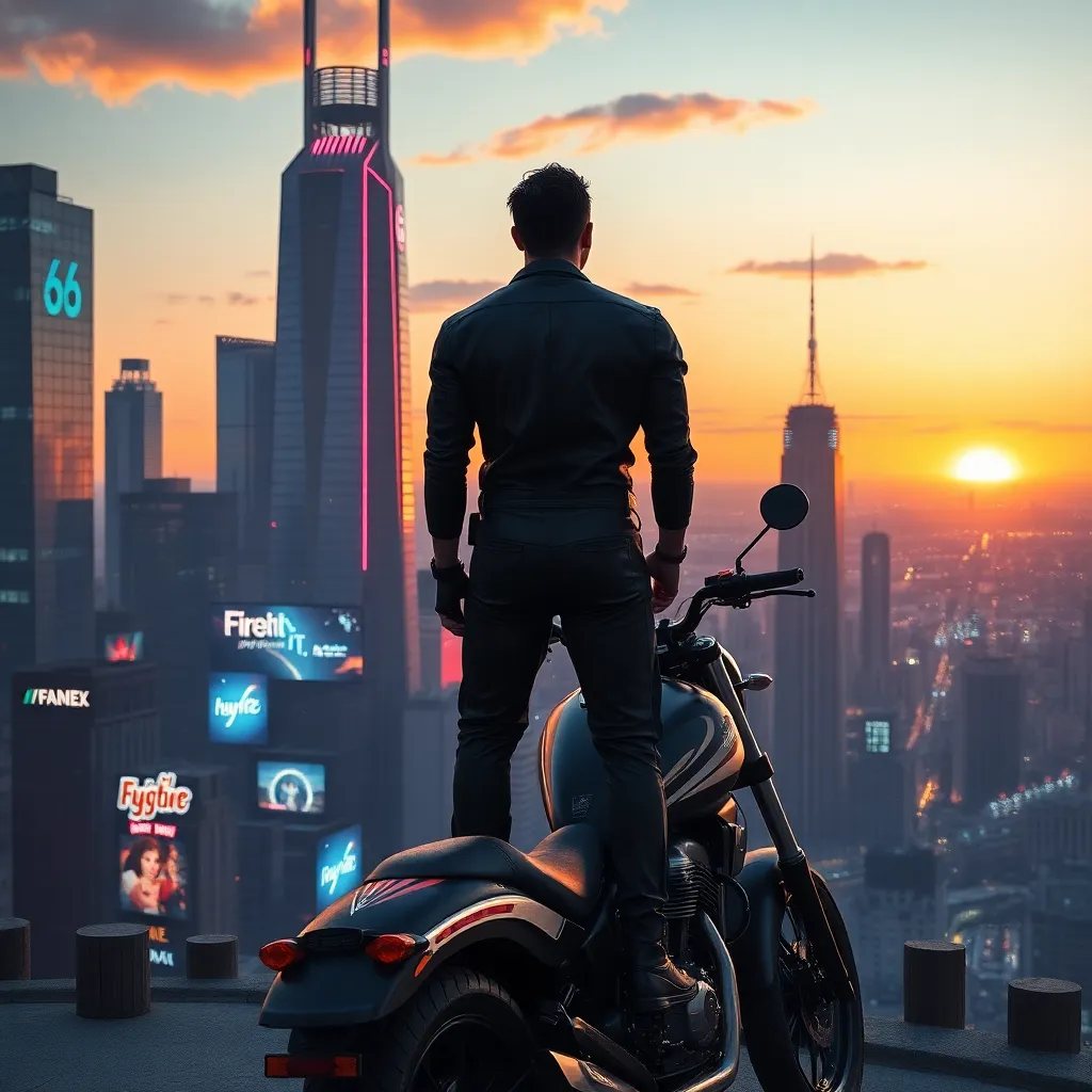 Create a futuristic cyberpunk cityscape at sunset, with neon-lit skyscrapers, holographic advertisements, and a sprawling metropolis in the distance. In the foreground, a lone figure in a sleek black jumpsuit stands atop a sleek motorcycle, looking out at the city with a confident, rebellious expression.