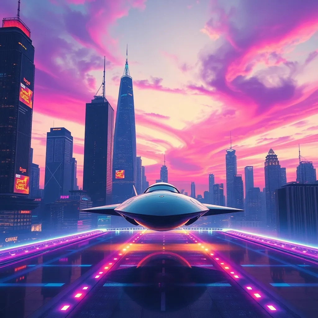 Create an enchanting, futuristic cityscape at dusk. Towering skyscrapers with neon lights and holographic advertisements stretch towards the sky. In the foreground, a sleek, silver spaceship descends onto a glowing, iridescent runway. The atmosphere is vibrant, with swirling clouds of purple and pink. Incorporate subtle, shimmering effects.