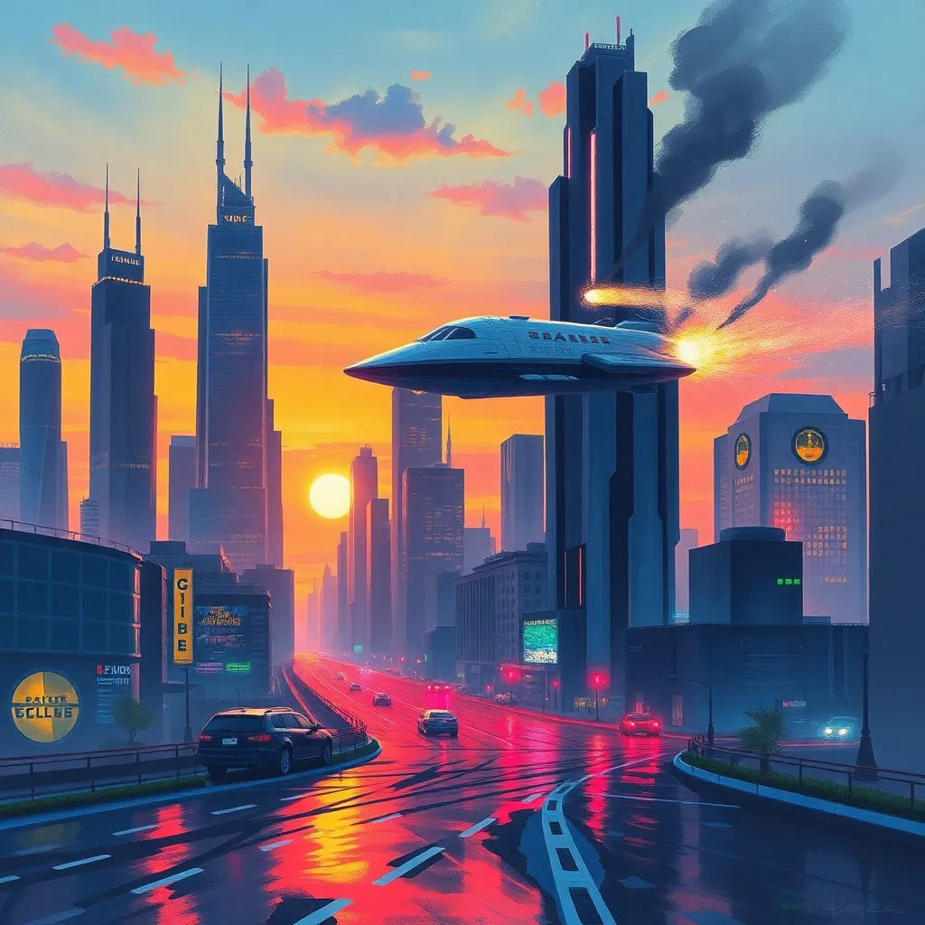 Create a futuristic cityscape at sunset, with towering skyscrapers and neon lights reflecting off the wet pavement. Incorporate a sleek, silver spaceship landing on the rooftop of the tallest building, with a trail of sparks and smoke behind it. Use vibrant colors and bold brushstrokes to capture the scene's energy.