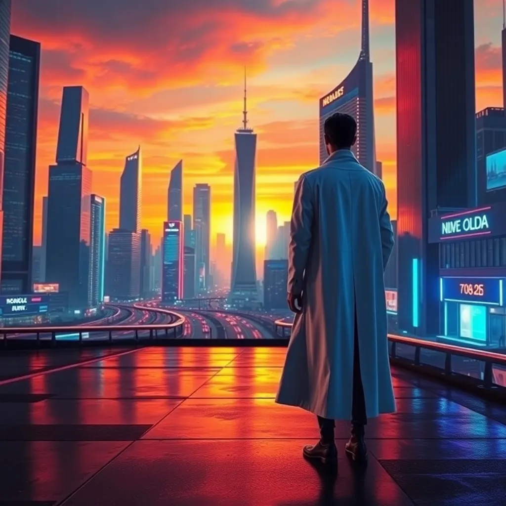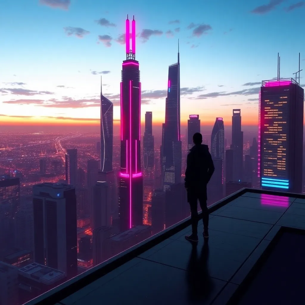 Create a futuristic cityscape at dusk, with neon-lit skyscrapers and a sprawling metropolis in the distance. Incorporate a lone figure standing on the edge of a rooftop, gazing out at the city with a mix of wonder and melancholy. Use bold colors and sleek lines to capture the essence of a utopian metropolis.