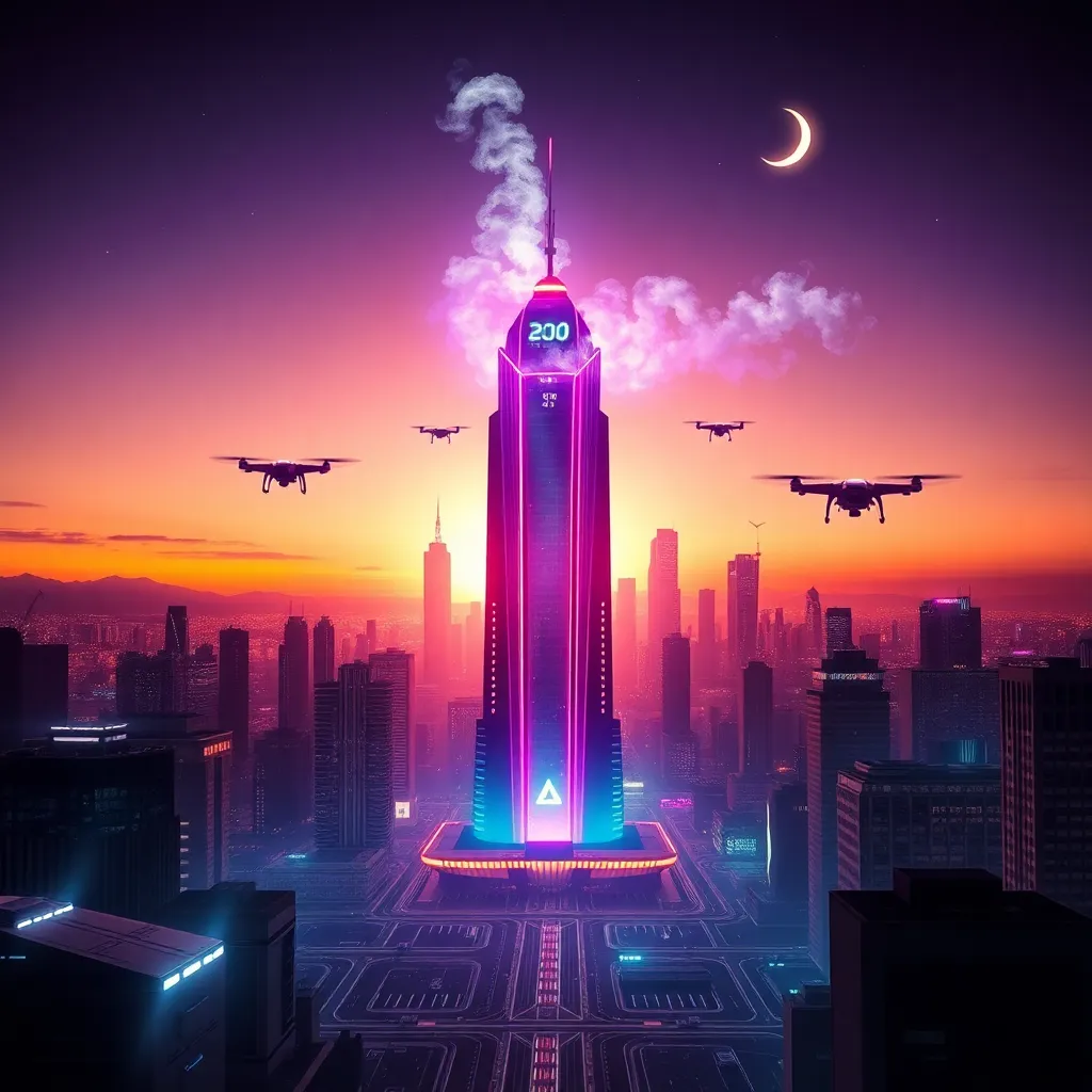 Create a futuristic cityscape at sunset with a neon-lit skyscraper in the center, surrounded by sleek hovercars and flying drones. Incorporate a glowing purple aura around the building, with a wispy cloud of smoke rising from the rooftop. Add a few stars and a crescent moon shining bright in the sky.