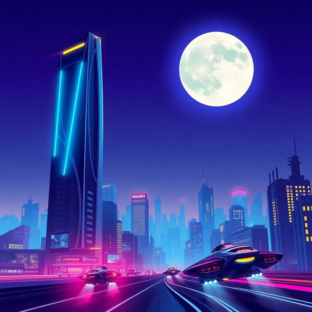 Create a futuristic cityscape at sunset, with towering skyscrapers and neon lights reflecting off a futuristic highway. Incorporate a sleek, high-tech hovercar zipping by, and a group of stylish E-Girls lounging on a rooftop, surrounded by holographic projections and retro-futuristic gadgets. Vibrant colors and bold lines, please!
