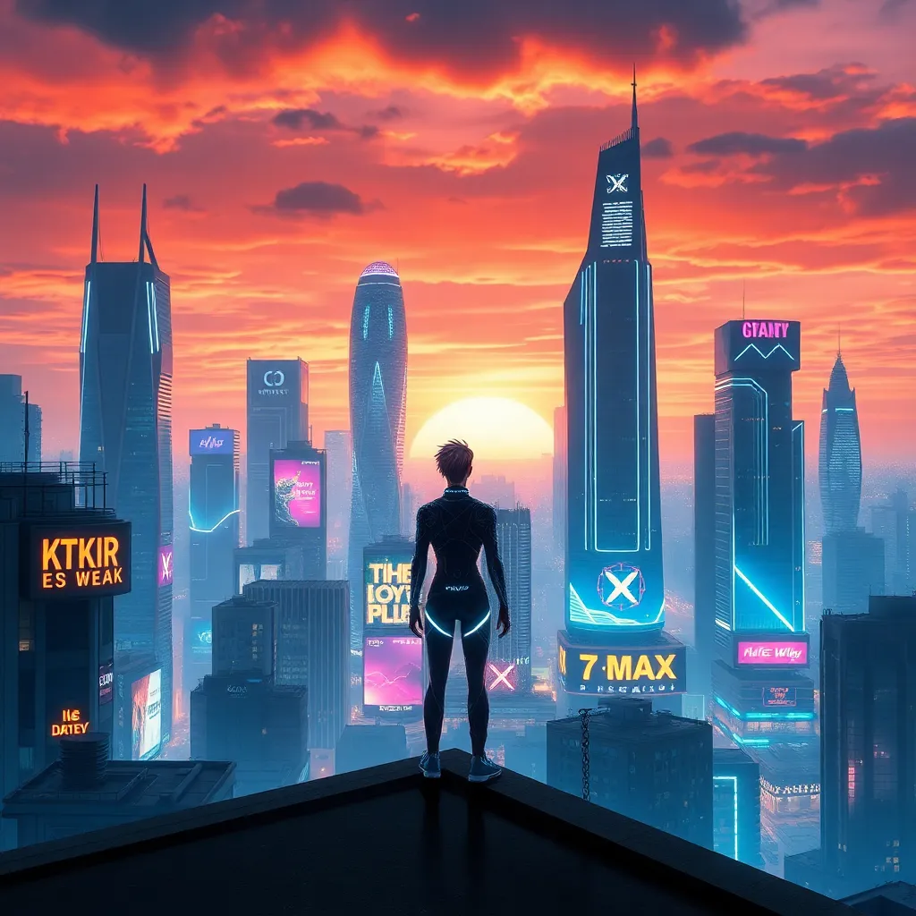 Create a futuristic, neon-lit cityscape at sunset. Incorporate sleek skyscrapers, holographic advertisements, and a lone figure standing on the rooftop, gazing out at the city. The figure should be dressed in a stylish, high-tech outfit with glowing accents. The atmosphere should be vibrant and energetic, with a hint of mystery.