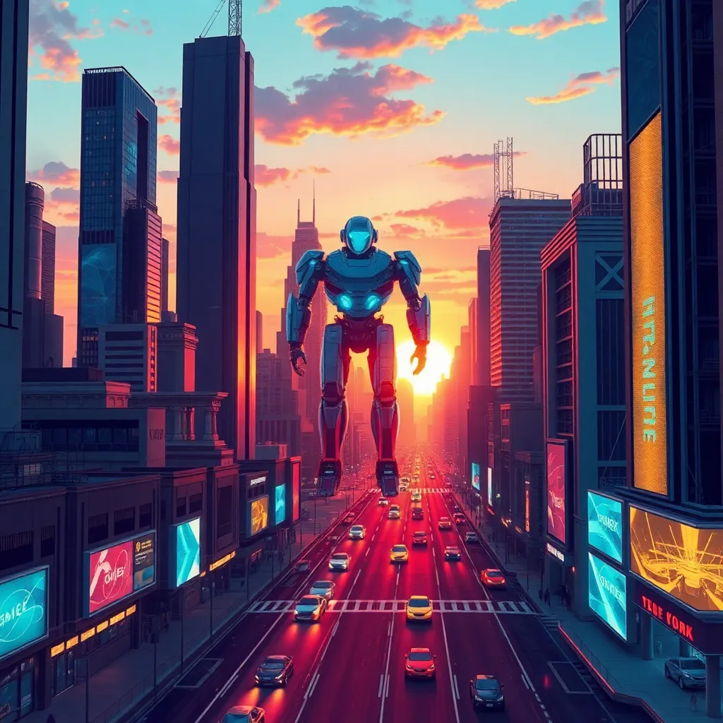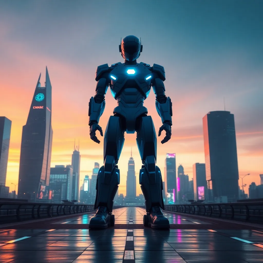 Create a futuristic cityscape at sunset, with sleek skyscrapers and neon lights reflecting off the wet pavement. Incorporate a giant robot standing tall in the center, its metallic body glowing with a soft blue light. The atmosphere should be vibrant and energetic, with a sense of technology and innovation.
