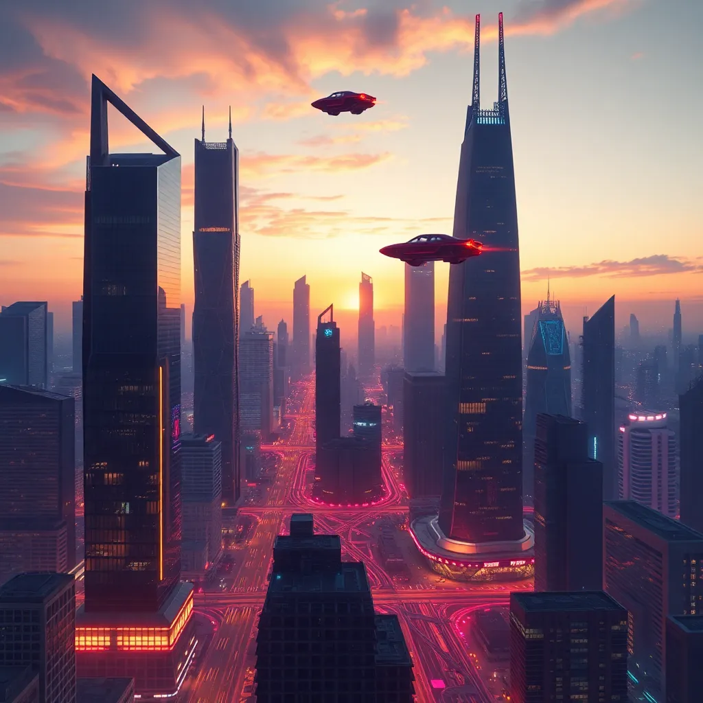 Create an AI-generated image of a futuristic cityscape at sunset, with sleek skyscrapers and neon-lit streets. Incorporate a subtle glow on the buildings, and a few flying cars hovering above the city. The atmosphere should be vibrant and energetic, with a hint of mystery and technological advancement.