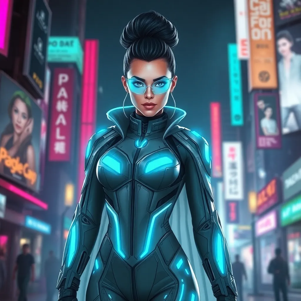 Create an AI-generated portrait of a futuristic, cyberpunk-inspired female warrior. She should be dressed in a sleek, high-tech jumpsuit with glowing blue accents and a flowing cape. Her hair should be styled in a bold, neon-lit updo. The background should be a dark, gritty cityscape with neon lights and holographic advertisements.