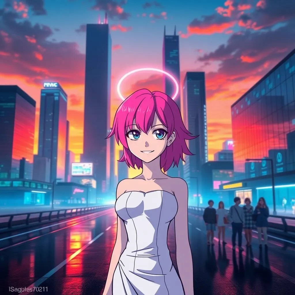 Create an image of a futuristic cityscape at sunset, with sleek skyscrapers and neon lights reflecting off the wet pavement. Incorporate a group of stylized, anime-inspired characters in the foreground, including a dominant female figure with vibrant pink hair and a confident smile, surrounded by a halo of light.