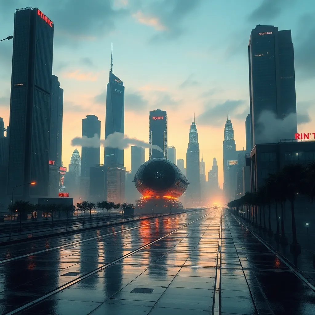 Create a futuristic cityscape at dusk, with sleek skyscrapers and neon lights reflecting off the wet pavement. Incorporate a retro-futuristic airship docked in the distance, with steam rising from its engines. Add a subtle hint of mystical energy emanating from the city's core, giving the scene an otherworldly glow.