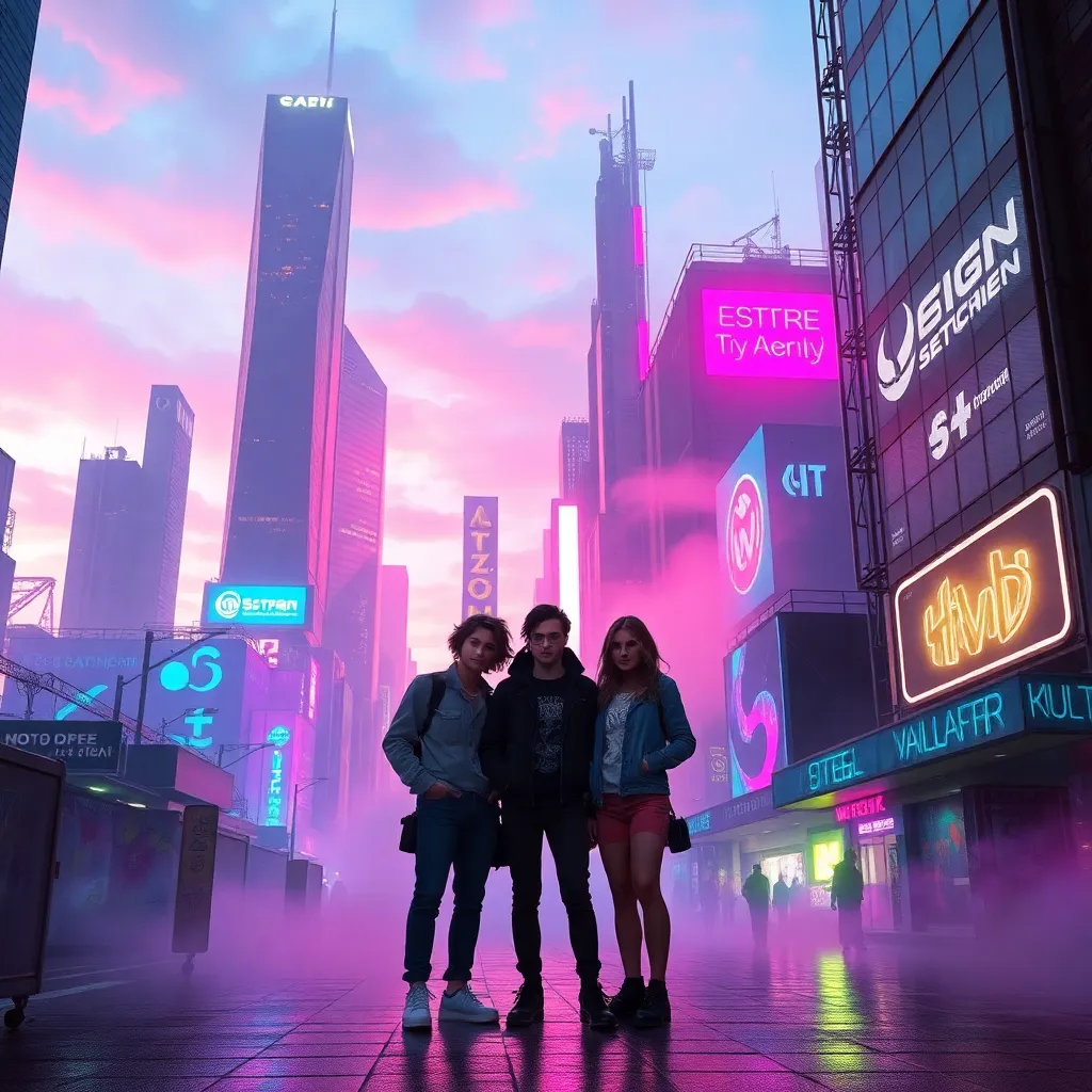 Create a futuristic, neon-lit cityscape at dusk, with towering skyscrapers and holographic advertisements. In the foreground, a group of three friends, each with a unique style, stand together, surrounded by a swirl of colorful fog and digital graffiti. Incorporate cyberpunk elements and a vibrant, glowing aesthetic.