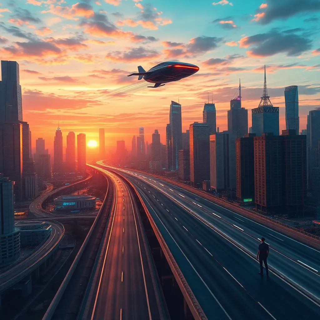 Create an AI-generated image of a futuristic cityscape at sunset, with towering skyscrapers, neon lights, and a sweeping highway that disappears into the distance. Incorporate a sleek, high-tech hovercar soaring through the sky, and a lone figure standing at the edge of the city, gazing out at the horizon.