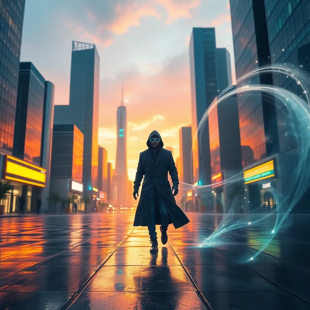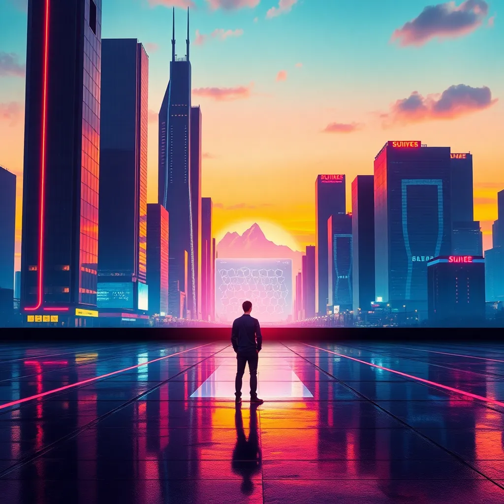 Create a futuristic cityscape at sunset, with sleek skyscrapers and neon lights reflecting off the wet pavement. A lone figure stands at the edge of the city, looking out at a distant mountain range with a holographic display floating above their hand. Incorporate vibrant colors and subtle sci-fi details.