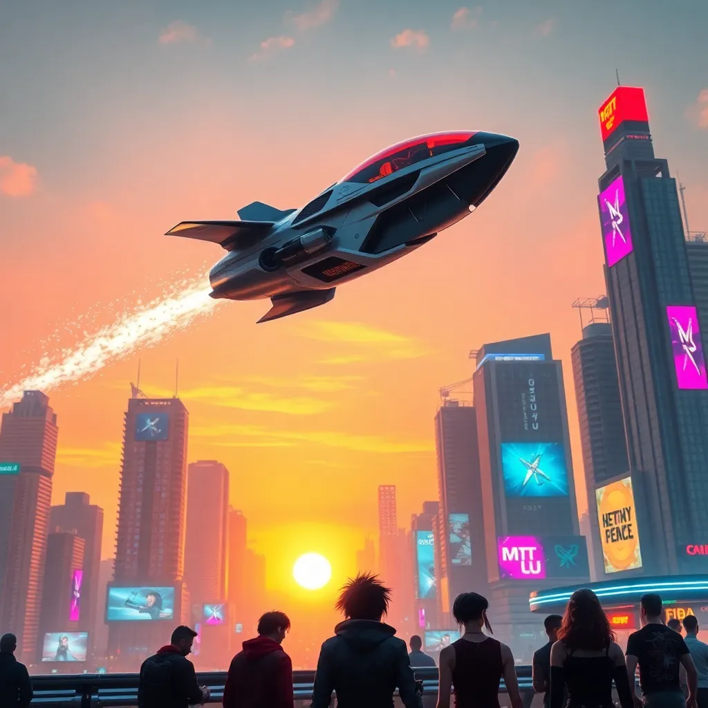 Create a futuristic, neon-lit cityscape at sunset. A sleek, silver hoverbike soars through the sky, leaving a trail of sparks behind it. The city's towering skyscrapers are adorned with vibrant, glowing advertisements. In the foreground, a group of edgy, cyberpunk-inspired individuals gather at a futuristic nightclub.