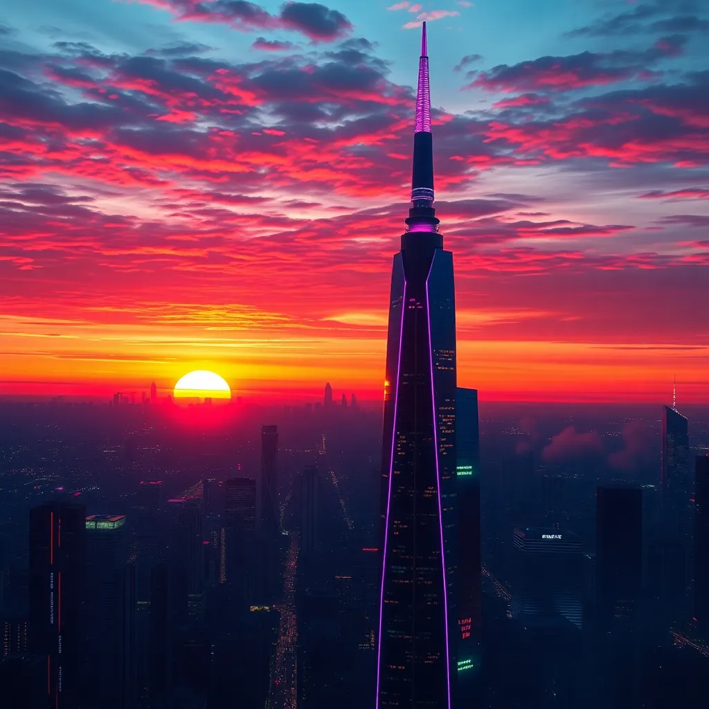 Create an AI-generated image of a futuristic cityscape at sunset, with a sprawling metropolis in the background and a sleek, neon-lit skyscraper in the foreground. Incorporate vibrant colors and bold lines to give the image a dynamic, high-tech feel. Add some subtle smoke or fog to enhance the atmosphere.