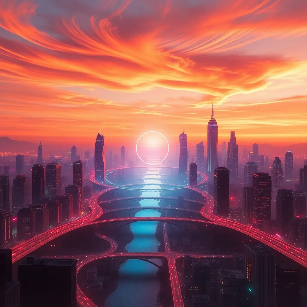 Create a futuristic cityscape at sunset, with sleek skyscrapers and neon lights reflecting off the wet pavement. In the foreground, a group of friends - a mix of humans and AI beings - gather around a holographic display, laughing and chatting as they plan their next adventure in a world of limitless possibilities.