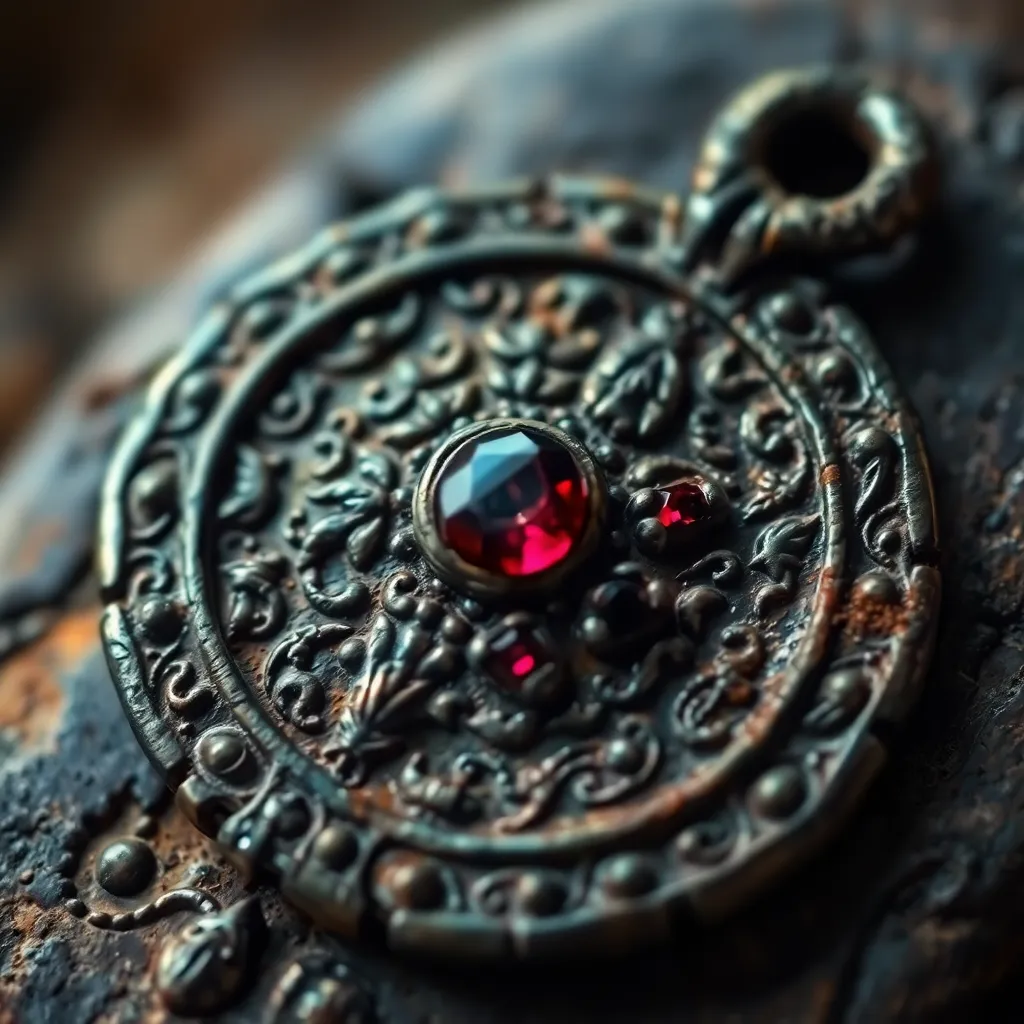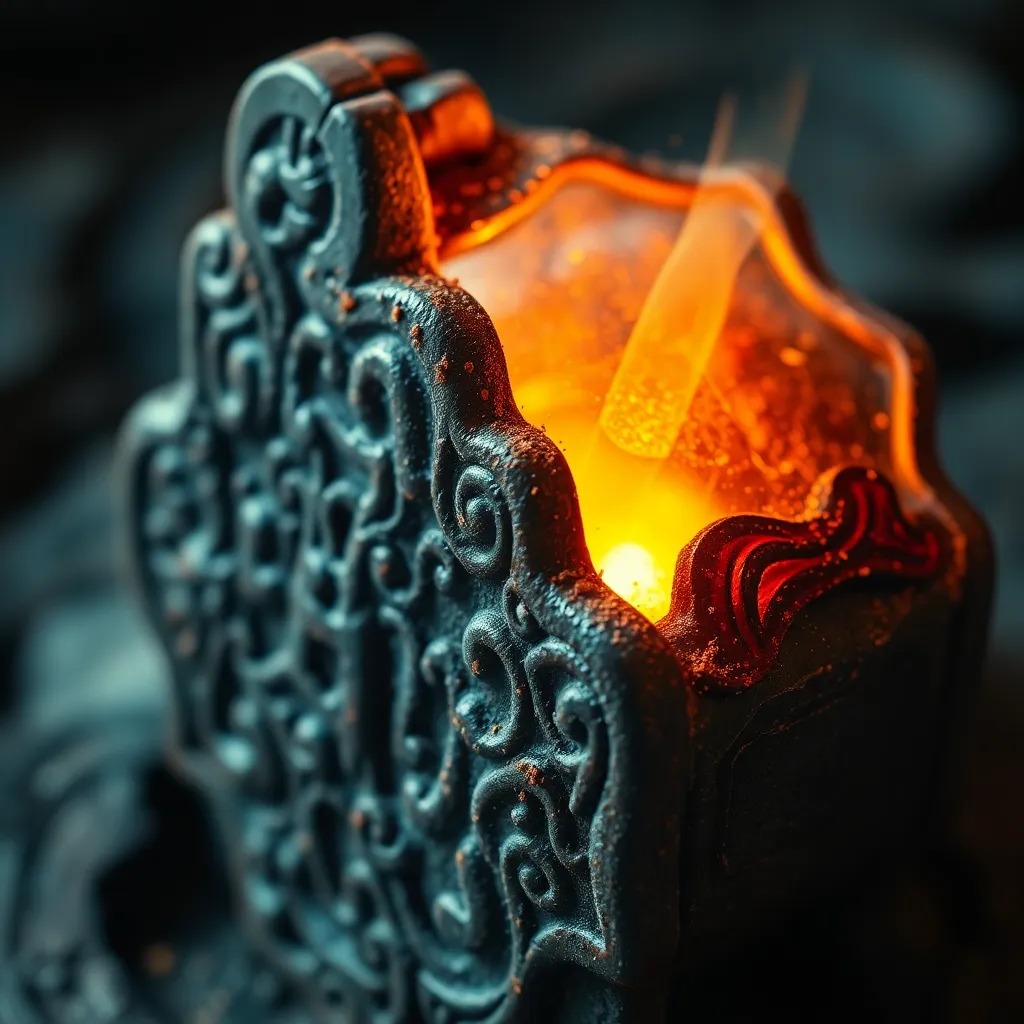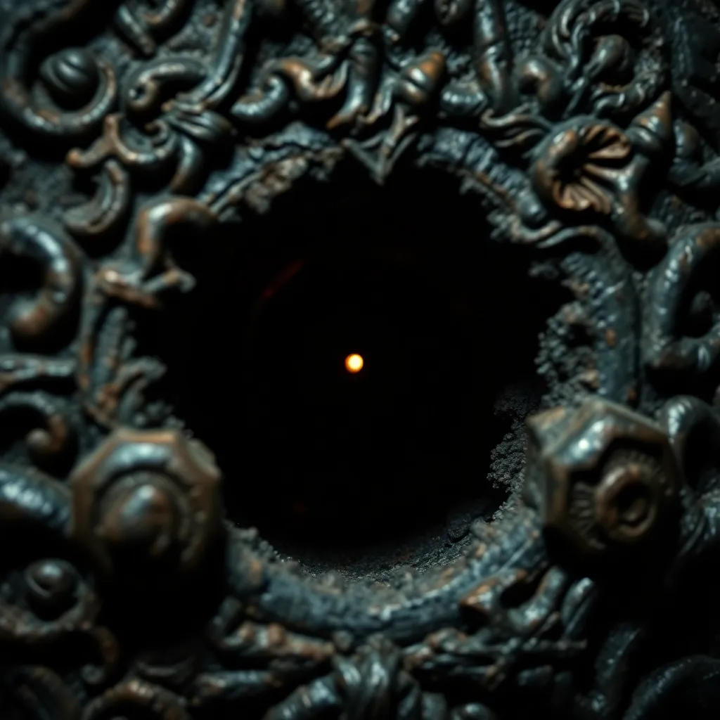Capture the intricate details of a mysterious, ancient artifact. Focus on the intricate carvings, rusted metal, and worn textures. The artifact is shrouded in darkness, with only a faint, eerie glow emanating from within. The extreme close-up reveals the tiny, almost imperceptible cracks and imperfections that tell its story.