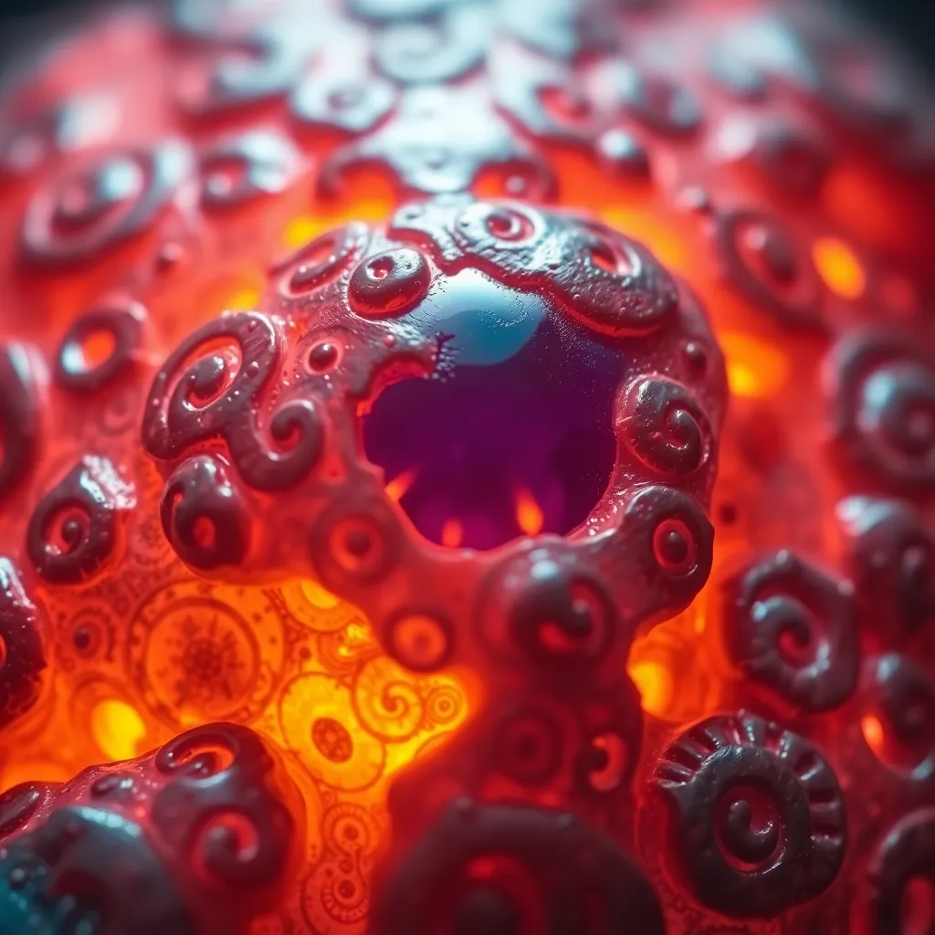 Create an extreme close-up of a mysterious, ancient artifact. The object is covered in intricate, swirling patterns and emits a soft, ethereal glow. Focus on the texture and details of the artifact, making the viewer feel like they're examining it with their own eyes. Use vibrant, otherworldly colors.