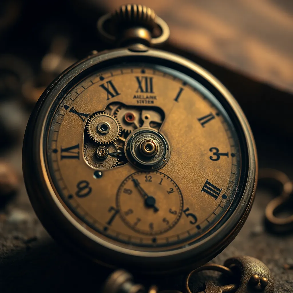 Create an extreme close-up of a forgotten, antique pocket watch. Capture the intricate details of the watch's mechanism, with gears, springs, and delicate engravings. The background should be blurred, with a warm, golden light illuminating the scene, as if the watch has been left untouched for decades in a dusty attic.